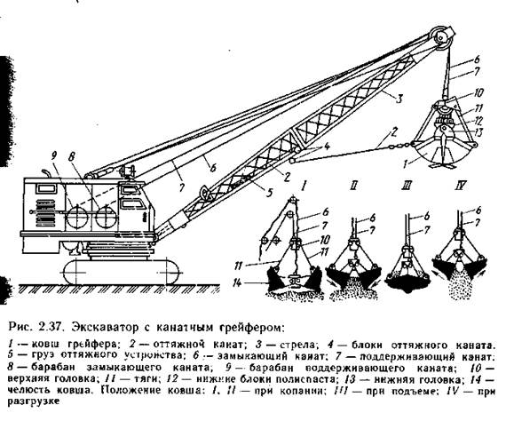 Грейфер применяют для разработки грунтов, расположенных ниже и выше уровня стоянки экскаватора, для погрузки и разгрузки сыпучих материалов, а так же при некоторых видах земельных работ (рытье глубоких котлованов). Грейферы бывают канатные и гидравлические. Обычно применяют двухканатные грейферы (2.37). Ковш 1 двухканатного грейфера подвешивают на поддерживающем 7 и замыкающем 6 канатах и стреле 3.