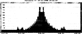 Рис. 6.5. Типовой спектр сигнала телефонной радиозакладки с широкополосной частотной модуляцией и параметрической стабилизацией частоты Панорама от 06-1-1995 14:43:03