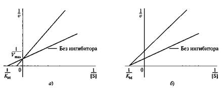 Рис. 6.11. График Лайнуивера—Бэрка для идентификации различных типов ингибирования: а — конкурентное ингибирование; б— неконкурентное ингибирование