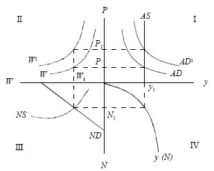 Рис. 8. Классическая модель ОЭР ND– спрос на труд; NS– предложение труда. В квадранте III формируется равновесие на рынке труда, где устанавливается ставка заработной платы (W1) и количество занятых (N1). В квадранте IV путем проецирования равновесного значения занятых (N1)на кривую производственных возможностей y (N)получаем равновесный объем национального продукта. В квадранте I равновесный объем национального продукта предполагает равенство совокупного предложения со спросом. Совокупное предложение представлено вертикальной линией AS, так как в условиях полной занятости производство максимально загружено и не может быть увеличено. Пересечение AS и AD дает не только равновесный объем прозиводства у, но и равновесную цену (P1). В квадранте II откладывается равновесная цена труда, которая, как и цена товара в квадранте I, зависит от количества денег в обращении, т. е. MV = PQ. Если предложение денег вырастет, то равновесие не нарушится, а лишь перейдет на более высокий уровень цен. Именно это и демонстрируют сдвиги кривых AD к AD? и W к W? квадрантах I и II. В целом классическая модель при одновременном равновесном состоянии рынков факторов производства, денег и благ показывает возможность достижения ОЭР. Кейнсианцы, определяя ОЭР, исходят из отличных от классической школы суждений: а) в экономике отсутствует гибкость цен и полная саморегуляция, что вызывает необходимость вмешательства государства (опосредованно, через экономическую политику); "Экономика. Конспект лекций" б) не предложение предопределяет спрос, а наоборот. Поэтому исходным является не рынок труда (квадрант III), а рынок благ (квадрант I); в) рынок денег не отделен от остальных рынков, а цены являются не номинальными величинами, а важным фактором формирования ОЭР.