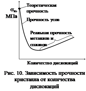 Итак, в реальной кристаллической решетке металлов всегда есть вакансии, дислокации, атомы примесей (имеющие другие атомные размеры), искажающие форму кристаллических ячеек и их параметры. Все это оказывает влияние на реальные свойства металлов (рис. 10). Наличие дислокаций в реальном металлическом крис-талле является причиной более низкой его прочности по сравнению с теоретической и одновременно придающей способность пластически деформироваться. Способность реального металла пластически деформироваться является его важнейшим полезнейшим свойством.
