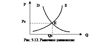 Из выше изложенного следует, что потребитель стремится приобрести больше товаров по низкой цене, а производитель стремится поставить больше товаров по высокой цене. Как найти ту цену, которая устраивала бы покупателя и производителя? Для этого необходимо совместить кривую спроса и предложения. Кривые пересеклись в точке Е, в ней установилось равновесие (рис. 5.12).