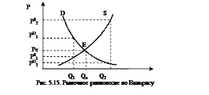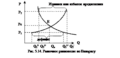 Однако фактические (продажные) цены не всегда совпадают с равновесными, поскольку рынок не всегда находится в состоянии равновесия. Но он тяготеет к состоянию равновесия, то есть состояние рыночного равновесия имеет тенденцию к устойчивости. В подтверждении этого рассмотрим случаи нарушения рыночного равновесия. Допустим, что в результате действия различных рыночных сил цена отклонилась от равновесия и установилась ниже равновесной: Р1 < Pe (рис. 5.14), в этом случае объем спроса превышает объем предложения (0Q1D) > (0Q1S), товар станет дефицитным, так как при этой цене потребители не смогут купить столько товаров, сколько они хотели бы. Избыток спроса (Q1D-Q1S) будет оказывать давление на цену, в сторону повышения, потребители будут стараться обойти друг друга, чтобы купить имеющийся товар, а производители отреагируют на это повышением цен и расширением производства. В конечном счете, цена опять достигнет уровня Ре. Если же реальная цена оказалась выше равновесной Р2 > Ре (рис. 5.14), производители пытаются изготовить и продать больше товаров, чем потребители готовы купить, т.е. предложение (0Q2S) превышает спрос (0Q2D), и на рынке образуется излишек (Q2S-Q2D) или избыток предложения. Что бы распродать этот избыток или не допустить его роста, производители начнут снижать цену. При уменьшении цены требуемое количество товара увеличится, а предполагаемое уменьшается до тех пор, пока не будет достигнута равновесная цена Ре.
