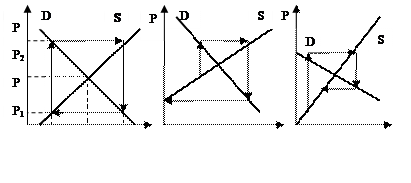 Если реальный объем производства выше равновесного (Qe > Q2), цена предложения будет выше цены спроса (PS 2 > PD2), то товары удастся продать только по цене спроса (PD2), то есть ниже себестоимости. Желающих производить товары по такой цене окажется немного. Предложение будет падать, пока не достигнет равновесного уровня. Цена при этом будет постепенно подниматься до равновесного уровня. Оба подхода к равновесию отражают рыночные реалии, причем, действие каждого из них проявляется в определенном временном интервале. Так, колебание цен (механизм Л. Вальраса) способствует установлению равновесия в краткосрочном периоде. Если товары уже произведены в определенном количестве, то приспособить объем предложения к размерам спроса возможно, лишь изменив цены. Таким образом, в модели Вальраса размеры производства заданы, а переменными оказываются цены. Изменение объема предложения (модель А. Маршалла) выступает на первый план в долгосрочном периоде. Поскольку только в долгосрочном периоде можно построить производственные мощности для удовлетворения любого объема спроса, главное, чтобы это принесло прибыль. В этих условиях именно цена становится главным ориентиром. В зависимости от того, насколько она привлекательна, производство либо наращивают, либо сокращают. Таким образом, в модели Маршалла, цена выступает как заданная, а предложение товаров окажется переменной величиной. Механизм равновесия можно также объяснить, используя иные модели, например, паутинообразную модель (рис. 5.16). Данная модель относится к числу динамических, поскольку учитывает фактор времени. Она рассматривает процесс формирования равновесия только в условиях, когда реакция участников сделок на изменяющиеся условия рынка растянута во времени.