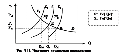 Уменьшение предложения (рис. 5.18) вызовет смещение кривой S в положение S1, в результате равновесие сместится из точки E в точку E1, вызывая увеличение равновесной цены до Ре1 и снижение равновесного объема Qe1. Увеличение же предложения вызовет смещение кривой S в положение S2, что приведет к увеличению равновесного объема до Qe2 и уменьшению равновесной цены до Ре2.