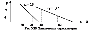 На рис. 5.20 представлены две кривые спроса, в первом случае изменения цены с 7 до 4 руб. не привело к резкому увеличению спроса (εd = 0,3), во втором случае спрос резко возрос (εd = 1,22).