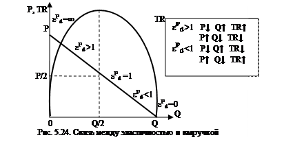 Эластичность линейной функции спроса изменяется от 0 (в точке пересечения кривой линейной спроса и осью абсцисс) до ∞ (в точке пересечения кривой линейной спроса и осью ординат). Если спрос по цене эластичный (εРd >1), то снижение цены вызовет рост выручки (поскольку незначительное снижение цены приведет к большему в процентном выражении росту объема спроса). Рост цены вызовет сокращение выручки (поскольку незначительное повышение цены приведет к большему в процентном выражении сокращению объема спроса). Если спрос по цене неэластичен (εРd <1), то снижение цены приведет к падению выручки. Рост цен вызовет рост выручки. В средине отрезка 0Q получим единственную точку на линейной кривой спроса с единичной эластичностью, в которой выручка максимальна и неизменна при любом изменении цены. В этом случае повышение доходности и рентабельности производства возможно за счет неценовых факторов.