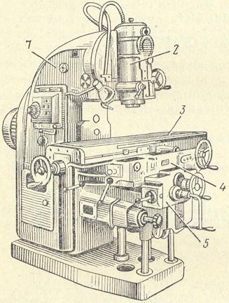 Рис. 156. Вертикальный консольно-фрезсрный станок 6М13П: 1 — станина; 2 — фрезерная головка; 3— рабочий стол; 4 — салазки; 5 — консоль