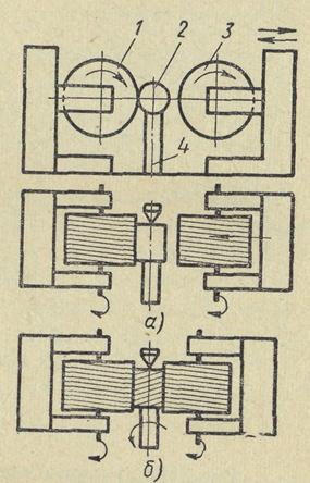 Рис. 190. Схема накатывания резьбы круглыми плашками