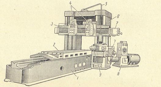 Рис. 192. Продольно-строгальный станок 7212: 1 — станина; 2 — стол; з — траверса (поперечина); 4 — вертикальные суппорты; б — подвеска пульта управления; в — портал; 7 — коробка подач вертикальных и боковых суппортов; 8 — привод стола; 9 — боковой суппорт