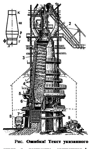 Цели и задачи доменного процесса Для того, чтобы иметь полное представление о доменном процессе и в целом о доменном производстве, необходимо первоначально познакомиться с общей схемой. Это позволит затем рассматривать отдельные элементы, имея представление об их месте в общем комплексе разнообразных процессов, протекающих в доменной печи, и общей технологической схеме производства чугуна. Целью доменного производства является получение высококачественного чугуна (заданного состава с низким содержанием примесей) с наименьшими топливно-энергетическими затратами и максимальной (заданной) производительностью. Требование минимальных топливно-энергетических запасов станет более очевидно при рассмотрении общей схемы доменного производства, объемов производства, расходов сырья на производство 1 тонны продукции и цен на сырье. Основной продукт доменной плавки – чугун. Следует отметить, что существуют также технологии доменной плавки, основным продуктом которых является шлак. Например, продукт бокситной плавки – шлак, используется для получения высококачественного бетона. Основным агрегатом для извлечения железа из железных руд является доменная печь. По принципу работы доменная печь относится к плавильным печам шахтного типа, печам, рабочее пространство которых вытянуто по вертикали, а горизонтальное сечение – окружность. Течение процессов в шахтных печах основано на противотоке материалов и горячих газов. Очертание рабочего пространства печи в вертикальном осевом сечении называется профилем. Профиль печи в зависимости от их геометрического очертания и технологического назначения делится на пять частей (рис.1.1‑1). Верхняя часть печи, имеющая цилиндрическую форму, называется колошником (К). Колошник доменной печи оборудован колошниковым устройством. Колошниковое устройство представляет собой комплекс металлоконструкций, различного назначения и включает в себя устройства для подачи и загрузки материалов в печь, газоотводы для равномерного отвода газов из печи (не менее 4), устройства для производства ремонтных и монтажных работ. Засыпной аппарат загрузочного устройства доменной печи служит для загрузки и распределения материалов в доменной печи. При этом он герметично закрывает печь и изолирует ее внутренне пространство от атмосферы.