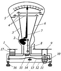 Рис.2. Кінематична схема (а) і загальний ви (б) важільних настільних циферблатних ваг з круговою шкалою 1 - стрілка, 2 - струнка, 3 - зубчаста пара, 4 - шарнірний паралелограм, 5 - квадрантний силовимірювач; 6 - тяга; 7 - вантажоприймальний важіль, 8 - рівень; 9 – вантажоприймальна площадка; 10 - тарувальна камера; 11 - изолир; 12 - масляний заспокоювач; 13 - головний важіль; 14 - плита; 15 - вантаж; 16 - футляр, 17 - тарокомпенсатор; 18 - корпус;