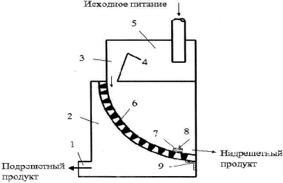 Рис. 4.2 Дуговой грохот 1- разгрузочный патрубок; 2-рама; 3-карман;4-стенка; 5- приемная коробка; 6- колосниковообразная решетка; 7-клин; 8-уголок; 9-упор для решетки.