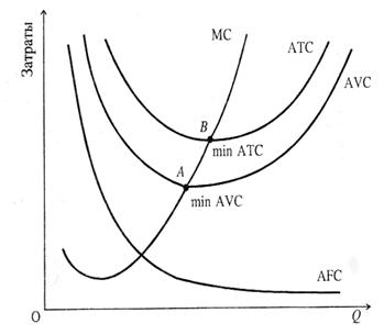 Разберем соотношения МС и АVС. Если переменные затраты, приходящиеся на единицу продукции выше предельных затрат, то они убывают с каждой последующей единицей произведенной продукции. В том случае, если АVC становится меньше МС, то значение AVC начинает возрастать. Поэтому между этими параметрами возникает равенство (на рис. это точка А), когда AVC принимает минимальное значение. Точно также доказывается и связь между МС и АС. В средних общих затратах определяющую роль играют средние переменные затраты, поэтому закономерности, справедливые для соотношения МС и AVC, справедливы и для МС и АС.