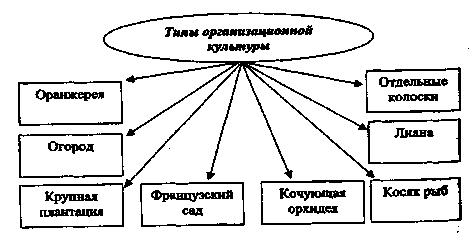 Рис. 32. Классификация организационных культур Организационная культура, соответствующая типу «оранжерея», характерна для статических организаций, которые стараются не реагировать на изменения, происходящие во внешней среде. Все усилия в этих организациях сосредоточены на сохранении достигнутого ранее. К собирателям отдельных колосков относятся мелкие и средние организации, деятельность которых целиком подчинена случаю и удаче. Их структуры носят неопределенный характер. Поведение таких организаций полностью зависит от воли руководителя. Мотивация персонала выражена слабо. Наблюдается постоянная текучесть кадров. Перспективы таких организаций малоутешительны. Организации, придерживающиеся культуры огорода, как правило, имеют пирамидальную структуру, характерную для многих французских предприятий. Эти организации стремятся к сохранению своих позиций на традиционном рынке, использованию проверенных временем моделей поведения с внесением в них минимального количества изменений. Мотивация персонала находится на низком уровне. Организационная культура, получившая название французского сада — это несколько измененный на американский манер вариант культуры «огорода» с ярко выраженной иерархической структурой. Отношения в такой организации бюрократизированы и люди в ней не более чем винтики, необходимые для функционирования системы. Организационная культура типа крупных плантаций характерна для предприятий с развитой дивизиональной структурой управления, имеющих несколько иерархических уровней и сочетающих в себе централизованную координацию с децентрализованным управлением. Отличительной особенностью является приспособление к изменениям окружающей среды, которое достигается благодаря наличию горизонтальных связей и гибкости персонала поощряемой системой мотивации. Организационная культура, созданная по типу лианы отличается сокращенным до минимума управленческим персоналом, использованием современных информационных технологий, ориентацией всех членов коллектива на достижение общей цели, высокоразвитым чувством ответственности сотрудников и высокой степенью мотивации персонала. Организационная культура, построенная по типу косяка рыб, свойственна предприятиям, отличающимся высокой маневренностью и гибкостью, постоянно корректирующим свою структуру и меняющим поведение в зависимости от изменений рыночной конъюнктуры. В такой организации особое внимание уделяется подбору высококвалифицированного персонала. Организационная культура кочующей орхидеи присуща неформальным организациям, которые, исчерпав возможности одного рынка, оперативно переходят к другому. Структура таких организаций постоянно меняется, количество сотрудников невелико. Главная цель - найти единственный в своем роде товар и предложить его максимальному числу клиентов. Мотивации персонала практически отсутствуют.