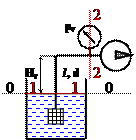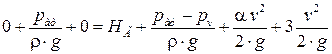 Насос за 10 минут перекачивает 6 м3 воды, по трубе диаметром 100 мм. Высота подъёма жидкости Hг = 4 метра. Потери напора рассчитать по формуле h1-2 = 3 v2/2g, где v – скорость в тубе. Рассчитать показание вакуумметра. Решение: Выберем два поперечных сечения там, где известны давления или где одно из давлений необходимо найти – одно по свободной поверхности жидкости, а второе где стоит вакуумметр.вакууметр. Нумеруем поперечные сечения по направлению движения жидкости в начале потока 1 – 1 в конце 2 – 2 (см. рисунок). Выбираем плоскость сравнения 0 – 0 проходящую через центр тяжести нижнего поперечного сечения. Находим значения z и абсолютные давления p в поперечных сечениях: z1 = 0; p1 = paт; z2 = Нг; p2 = paт – pv. Расписывают скорости в поперечных сечениях. Площадь поперечного сечения бака большая, поэтому скорость в первом поперечном сечении можно считать равным нулю, а площадь второго поперечного сечения равна площади поперечноготоперечного сечения трубы, поэтомутоэтому скорость во втором сечении равно скорости в трубе: v1» 0; v2 = v. Полученные значения z, p, v подставляют в уравнение Бернулли: