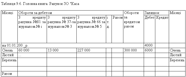 До журналів відкривають окремі відомості за дебетом рахунків, відомості аналітичного обліку до рахунків даного журналу. Так, з метою посилення контролю за рухом і збереженням грошових коштів поряд із журналом за кредитовою ознакою ведуть допоміжні відомості за дебетом цих рахунків. Оскільки в журналах ведуть тільки синтетичний облік, то для потреб аналітичного обліку за рахунком даного журналу відкривають окремі відомості аналітичного обліку. За рахунками, які охоплюють велику кількість обліковуваних об'єктів (основні засоби, виробничі запаси, розрахунки з оплати праці тощо) аналітичний облік ведуть так само, як і за інших форм обліку — на картках або в книгах. Записи в журнали здійснюють безпосередньо на підставі перевірених документів у порядку їх надходження й опрацювання. Якщо кількість однорідних документів за операціями значна, то їхні дані попередньо групують у допоміжних відомостях, місячні підсумки яких переносять потім у відповідні журнали. Наприкінці місяця за кожним журналом підбивають підсумки зроблених записів. Загальний підсумок за кредитом рахунка в журналі порівнюють з підсумками кореспондуючих за дебетом рахунків. Це забезпечує перевірку правильності облікових записів без складання оборотних відомостей. Оборотні відомості складають тільки за тими рахунками, за якими ведуть картки (книги) аналітичного обліку. Після закінчення місяця журнали і відкриті до них відомості підписуються працівниками бухгалтерії, котрі складали їх, і головним бухгалтером. Місячні обороти журналів переносять у Головну книгу, про що роблять відповідні відмітки. Головна книга є системним регістром синтетичного обліку, де узагальнюються дані поточного обліку, проводиться взаємна перевірка записів. У Головній книзі для кожного синтетичного рахунка відводять окрему сторінку. Будову Головної книги за журнальної форми показано в табл. 9.6 (с. 242).