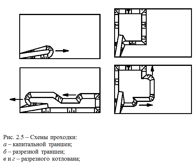 Вскрытие рабочих горизонтов осуществляется посредством сооружения специально предназначенных для этого выработок. Для обеспечения перевозок горной массы каждый горизонт должен быть вскрыт капитальной траншеей (рис. 2.5, а), как правило наклонной, так как она соединяет отметку вскрываемого горизонта с отметкой уже действующих горизонтов и поверхности. Горные работы на горизонте начинают с создания первоначального фронта, для чего проводят разрезную траншею (рис. 2.5 б) или разрезной котлован (рис. 2.5, в). Иногда породу, если позволяют параметры экскаваторов, размещают в прибортовом отвале, но чаще ее транспортируют на внешний отвал. Далее производится разнос одного или двух бортов разрезной траншеи (см. рис. 2.5, б) или разрезного котлована (рис. 2.5, г). После необходимого опережения верхнего уступа появляется возможность вскрытия нижерасположенного горизонта и проведения в его пределах разрезной выработки. Продольный уклон рабочих горизонтов должен устанавливаться с учетом обеспечения безопасности работы транспортных средств при погрузке.