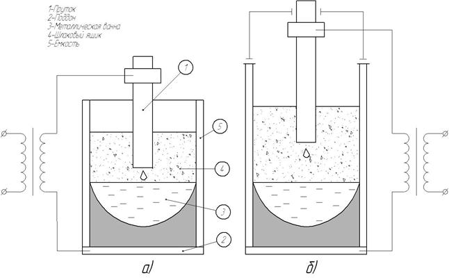 Рис. 3.5 Схемы электрошлакового (а) и вакуумно-дугового (б) переплава стали