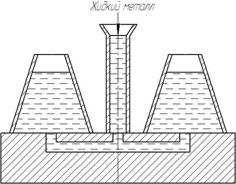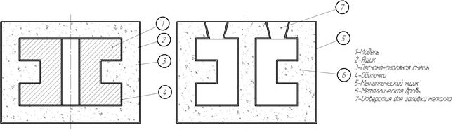 Кокиль нагревают до температуры 300°С и заливают жидким металлом. После охлаждения форму снимают.