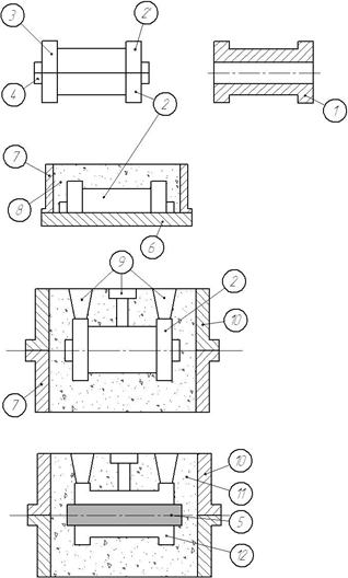 Сначала из дерева или металла изготовляют модель. Размеры модели учитывают усадку металла (чугун- 1%, сталь- 2%). Модель для изготовления отливки 1 состоит из нижней 2 и верхней 2/ половин, соединенных штифтами. На модели предусмотрены знаки 4 выступа, формирующие место для установки стержней 5. Стержень 5 - элемент, с помощью которого ограничивают полость для образования внутренней поверхности отливки. Техпроцесс изготовления отливки включает следующие операции: 1) Формовка – формирование полости для последующей заливки металла. Нижнюю половину модели устанавливают на подмодельную плиту 6, затем ставят металлическую опоку 7, засыпают формовочной смесью 8 и утрамбовывают. Формовочная смесь состоит из песка, глины и связующих веществ (масла, декстринового клея, цемента, жидкого стекла), а также противопригарных материалов (каменноугольной пыли, мазута, специальных эмульсий). Опоку переворачивают и по штырям устанавливают верхнюю половину 3 модели и модель литниковой системы 9, для заливки металла устанавливают опоку 10, засыпают формовочную смесь и утрамбовывают её. 2) Удаление модели из опок и установка стержней для получения внутренних полостей заготовки. 3) Заливка – заполнение полости формы жидким металлом – чугуном, сталью, цветными металлами или сплавами через литниковую систему 9 из ковша емкостью от 10 кг до 10 тонн. 4) Охлаждение и выбивка отливок – освобождение заготовки от формовочной смеси. 5) Очистка – удаляют литниковую систему и остатки формовочной смеси. Этот метод используется в единичном и мелкосерийном производстве. Достоинство - возможность получения сколь угодно сложных форм. Недостатки: 1) низкая точность (17 квалитет); 2) наличие пригаров и формовочной смеси на поверхности заготовки; 3) большая шероховатость поверхности; 4) необходимость изготовления моделей и стержней; 5) однократное использование моделей; 6) необходимость старения; 7) вредные условия труда.