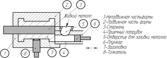 Сущность состоит в заливке полости металлом под большим давлением. Литье под давлением выполняют на специальных машинах в разборные металлические охлаждаемые формы, состоящие из неподвижных 1 и подвижных 2 частей, стержня 3 и приемного патрубка 4. После закрытия прессформы в отверстие 5 подают жидкий металл, перемещая его плунжером 6, создающего давление до 1000 кг/см2. После остывания отливки, подвижная часть 2 отводится, стержень 3 убирают и отливку выталкивают толкателем 8. Достоинства: 1) высокая точность (13 квалитет); 2) низкая шероховатость (Ra=6,3 мкм); 3) возможность многократного использования прессформы; 4) высокая производительность (до 2000 шт/ч). Недостатки: 1) высокая стоимость прессформы и оборудования; 2) малая масса отливок; 3) технологические сложности при изготовлении чугунных и стальных отливок. Применяют в массовом производстве для деталей алюминиевых, медных, цинковых сплавов. 4.6 Центробежное литье