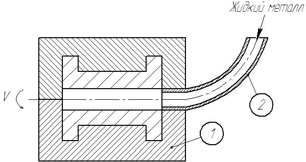 Осуществляется на специальных центробежных машинах. Во вращательную металлическую разъемную форму 1 заливается жидкий металл. Металл поступает через центральное отверстие 2. Под действием центробежной силы он отбрасывается к наружным стенкам полости, уплотняется и принимает ее форму. Более легкие неметаллические включения оттесняются к внутренним поверхностям отливки, и при механической обработке легко удаляются. При производстве отливок простой формы (трубы, втулки) внутренние поверхности можно не ограничивать. Достоинства: 1) высокое качество отливки; 2) концентрация неметаллических включений на ее внутренних поверхностях; 3) высокая производительность; 4) возможность многократного использования форм; 5) возможность изготовления 2-х сложных (биметаллических) отливок. Недостатки: 1) узкие технологические возможности, так как возможно применять только для тел вращения; 2) сложное оборудование.
