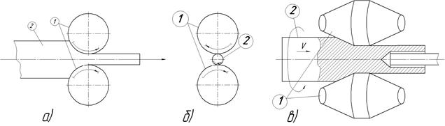 5.1 Прокатка металла. Прокаткой называется процесс обработки металла давлением путем обжатия его вращающимися валками прокатного стана. Имеется три вида прокатки: а) продольная; б) поперечная; в) косая (рис. 5.1).