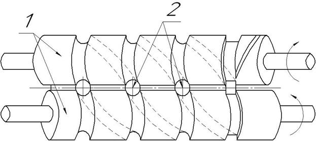 Сущность метода в образовании фасонной поверхности цилиндрических деталей, путем деформирования поверхностного слоя металла вращающимся фасонным инструментом. Пример получения зубчатого колеса. Заготовку 1 нагревают ТВЧ. Гладкий валок 3 вращается и перемещается в радиальном направлении на заготовку, подавая ее на зубчатый валок инструмента 2. В результате чего на деформируемом поверхностном слое материала заготовки образуются зубья. Валок 3 прикатывает зубья заготовки 1 по наружной поверхности. Обработку длинных деталей производят поперечно винтовой накаткой (по аналогии с прокаткой) Применяется для изготовления резьбовых поверхностей, шлицевых валов, мелкомодульных колес.