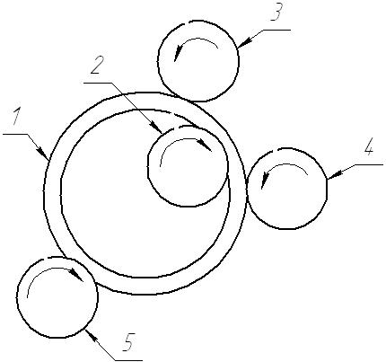 Сущность метода в увеличении диаметра кольцевой заготовки за счет утонения ее стенок путем деформации между вращающимися валами. Заготовку 1 надевают на валок 2. Затем подводят вращающийся валок 3, который заставляет вращаться заготовку 1 и валок 2. При сближении валков 2 и 3 толщина заготовки 1 уменьшается, а диаметр увеличивается. Валик 4 обеспечивает правильность формы кольца. При касании кольцом контурного ролика 5 раскатка прекращается. 5.8.3 Накатка.