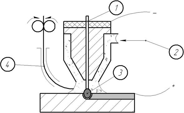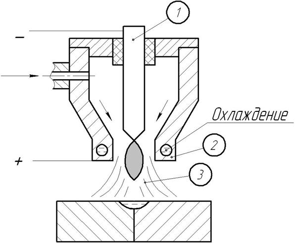 Аргонодуговая сварка выполняется как плавящимися, так и неплавящимися электродами. При сварке неплавящимися электродами, например вольфрамовым (ТПЛ = 3370°C) электродом 1 в зону горения дуги 3 подают аргон 2, присадочную проволоку 4. Сварку плавящимся электродами выполняют без присадочной проволоки. Сварка в углекислом газе выполняется только плавящимися электродами. Достоинства: 1) надежная защита от атмосферы воздуха, отсутствие на поверхности шва окислов и шлаковых включений; 2) возможность выполнения вертикальных швов; 3) возможность наблюдения за формированием шва и его регулирование; 4) отсутствие флюсовой пыли; Недостатки: 1) разбрызгивание металла; 2) неудобство применения на открытом воздухе из-за ветра; 3) ухудшение условий труда, требуется защита глаз от действия света дуги. Области применения - все отрасли машиностроения. Тип производства - серийное и массовое. 6.2 Плазменная сварка. Плазменная сварка - это сварка при помощи сжатой дуги. В плазменной горелке дуговой разряд возникает между вольфрамовым электродом 1 и медным соплом 2, через которое пропускают газ (аргон, углекислый газ). Сопло имеет отверстие для выхода из камеры плазменной струи, представляющей собой поток ионизированных частиц с t = 10... 18 тыс. °C. Газ сжимает столб дуги, плотность в ней повышается. Способ применяют для сварки высоколегированных сталей, сплавов на основе титана, молибдена, вольфрама.