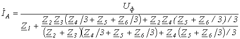 При анализе сложных схем, работающих в симметричном режиме, расчет осуществляется с помощью двух основных приемов: Все треугольники заменяются эквивалентными звездами. Поскольку треугольники симметричны, то в соответствии с формулами преобразования «треугольник-звезда» Так как все исходные и вновь полученные звезды нагрузки симметричны, то потенциалы их нейтральных точек одинаковы. Следовательно, без изменения режима работы цепи их можно (мысленно) соединить нейтральным проводом. После этого из схемы выделяется базовая фаза (обычно фаза А), для которой и осуществляется расчет, по результатам которого определяются соответствующие величины в других фазах. Пусть, например, при заданном фазном напряжении В соответствии с указанной методикой выделим расчетную фазу А, которая представлена на рис. 4. Здесь Тогда для тока