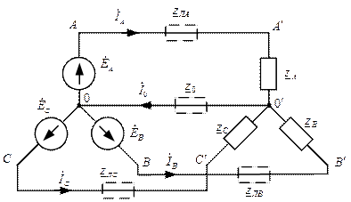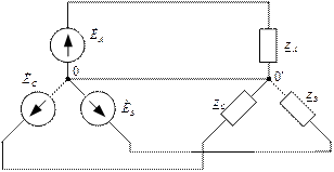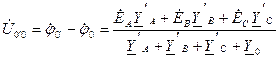В общем случае необходимо учитывать сопротивления линейных и нулевых проводов. Воспользуемся методом узловых потенциалов: