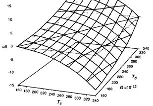 де G - константа. Тобто, що залежність між температурою об'єкта й вихідною напругою (передатна функція) є не тільки нелінійною (параболою четвертого порядку), але вона також залежить від температури поверхні чутливого елемента. Для визначення чутливості такого датчика стосовно температури об'єкта, треба отримати частинну похідну від останнього виразу: