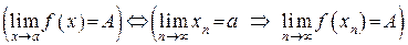 Определение предела функции на языке последовательностей. Будем говорить, что функция имеет в точке предел, равный , если для любой последовательности такой, что , и сходящейся к : , выполняется равенство . Другими словами, если последовательность сходится к , то последовательность значений сходится к :