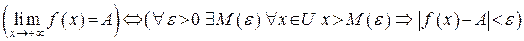1.3. Предел функции при . Будем говорить, что функция имеет при предел, равный , если для любого числа найдется число такое, что для всех , удовлетворяющих условию , выполняется неравенство :