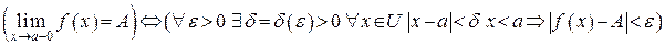 3.2. Левосторонний предел. Будем говорить, что функция имеет в точке предел слева, равный , если для любого числа найдется число такое, что для всех , удовлетворяющих условию и , выполняется неравенство и будем писать :