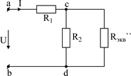 Полученное сопротивление эквивалентно сопротивлению (рис.25) исходной схемы со смешанным соединением. Понятие “эквивалентно” означает, что напряжение U на входных зажимах и ток I входной ветви остаются неизменными на протяжении всех преобразований.