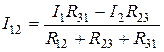 Напряжение между этими же точками схемы звезды равно: U12=I1R1-I2R2. Т.к. речь идет об эквивалентном преобразовании, то необходимо равенство напряжений между данными точками двух схем, т.е.