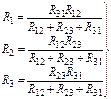 Преобразование звезды в эквивалентный треугольник. При переходе от звезды к треугольнику известными являются сопротивления R1, R2, R3 лучей звезды. Значения сопротивлений треугольника определяются в результате совместного решения уравнений (25):