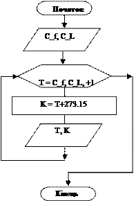 Розв’яжемо задачу. Потрібно написати програму для переведення значення температури, заданої в шкалі Цельсія, у значення, що відповідають шкалі Кельвіна Позначимо початкове значення температури (first temperature) у Цельсіях () – C_F, а кінцеве значення (last temperature) – C_L. Температуру в Кельвінах – K. Параметр циклу позначимо змінної T. В циклі виконуються два оператори. Їх слід перетворити в один складений оператор за допомогою операторних дужок begin... end.