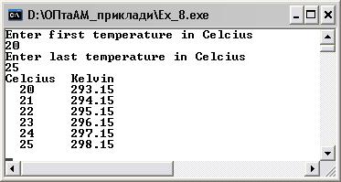 program Ex_8; var C_f,C_L,t:integer; K:real; begin writeln('Enter first temperature in Celcius '); readln(C_f); writeln('Enter last temperature in Celcius '); readln(C_L); writeln('Celcius','Kelvin':8); For T:=C_f to C_L do begin K:=T+273.15; writeln(T:4,K:11:2); end; readln end.