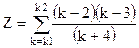 program Project1; var z:real; k,k1,k2:integer; begin write('Enter k1='); readln(k1); write('Enter k2='); readln(k2); z:=0; for k:=k1 to k2 do if (k<>2)and (k<>3)and (k<>-4) then z:=z+(k-2)*(k-3)/(k+4); writeln('z=',z:6:2); readln end.