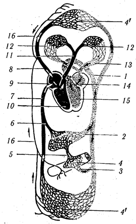 кровообращения, правая — малый. Большой круг кровообращения начинается от левого желудочка сердца, проходит через ткани всех органов и возвращается в правое предсердие. Из правого предсердия кровь переходит в правый желудочек, откуда начинается малый круг кровообращения, который проходит через легкие, где венозная кровь, отдавая углекислый газ и насыщаясь кислородом, превращается в артериальную и направляется в левое предсердие. Из левого предсердия кровь поступает в левый желудочек и оттуда вновь в большой круг кровообращения.