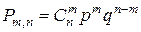 где Доказательство. Обозначим через Bm событие, состоящее в том, что в п независимых повторных испытаниях событие А наступит m раз. Событие Bm есть сумма несовместимых событий - вариантов события Bm. Каждый вариант определяется номерами тех m испытаний, которые завершились появлением события А. Число всех вариантов равно, очевидно, Вероятность каждого варианта ввиду независимости испытаний равна По теореме сложения для несовместимых событий получаем