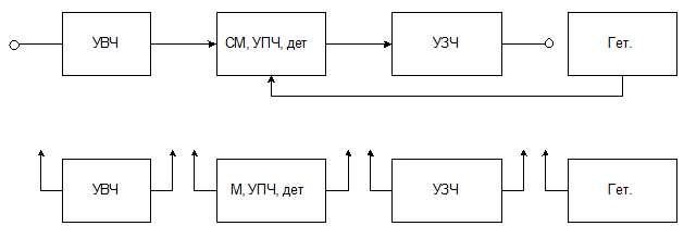 Кратностью резервирования m называют отношение числа резервных устройств к числу основных (в рассматриваемом примере кратность резервирования m=1). Возможны следующие методы резервирования: а) резервирование общее постоянное (замещением); в) резервирование раздельное постоянное (замещением); При общем постоянном резервировании основной и резервные аппараты постоянно и параллельно подключены к источнику сигнала, нагрузки и источнику питания; поэтому в случае выхода из строя одного из основных аппаратов рабочие функции начинают выполнять резервные. Особенностью такой схемы резервирования является то, что при выходе из строя одного из аппаратов изделие продолжает выполнять функции без какого-либо перерыва во времени. При общем постоянном резервировании, когда основной и резервные аппараты имеют одинаковую надежность, вероятность безотказной работы резервированного изделия и среднее время наработки на отказ могут быть определены по формуле: P(t)p = 1-[1-P(t)]m+1 , где P(t) - вероятность безотказной работы нерезервированного изделия, P(t)р - вероятность безотказной работы резервированного изделия, m - кратность резервирования. Для случая, когда краткость резервирования m=1, формула принимает вид P(t)p = 1-[1-P(t)]2 , Из этих формул следует, что при общем постоянном резервирований средняя наработка на отказ возрастает незначительно (в полтора раза при m=1). Преимуществом такого метода резервирования является то, что при его применении выход из строя одного из одновременно работающих блоков не приводит даже к кратковременному нарушению функций, выполняемых аппаратурой. Однако в этом случае габариты и стоимость аппаратуры возрастают пропорционально (m+1), т.е. как минимум в 2 раза. Кроме того возникают некоторые сложности в обеспечении нормальной работы аппаратуры при ее параллельном соединении. В тех случаях, когда основной и резервные аппараты не могут быть одновременно подключены к нагрузке, применяют резервирование замещением, т.е. резервное изделие подключают вместо основного только в случае выхода его из строя. Раздельное резервирование. На рис. 2. дана схема приемника, который должен резервироваться. Этот приемник состоит из N блоков (N=4). Резервный комплект также состоит из N блоков. Однако в отличие от рассмотренных способов резервирования в случае выхода из строя одного блока основного комплекта, например УЗЧ, в работу включается не весь резервный комплект, а только один из блоков, а остальные продолжают оставаться в резерве. Если в схеме и конструкции аппарата нет недостатков, которые бы приводили к систематическим отказам блоков, то при дальнейшей работе аппарата повторный выход из строя одного и того же блока (в нашем примере УЗЧ) является маловероятным. Наиболее вероятно, что следующий отказ произойдет в другом блоке, который опять может быть заменен блоком из числа резервных. Аппаратура выйдет из строя только тогда, когда отказ в блоке одного и того же типа произойдет дважды (m=1).