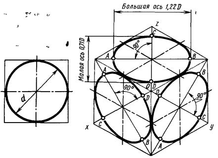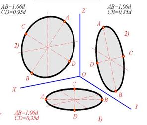 Надо запомнить, что малая ось CD каждого эллипса всегда должна быть перпендикулярна большой оси АВ. Если окружность расположена в плоскости, параллельной плоскости П1, то большая ось АВ должна быть перпендикулярна оси z, а малая ось CD- параллельна оси z. Большие оси всех трех эллипсов направлены по большим диагоналям ромбов. Большая ось эллипса = 1,22d. Малая ось = 0,71d. Поскольку черчение лекальных кривых - эллипсов вызывает определенную трудность, то их заменяют более простыми циркульными кривыми – овалами.