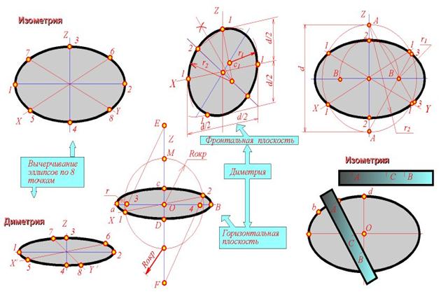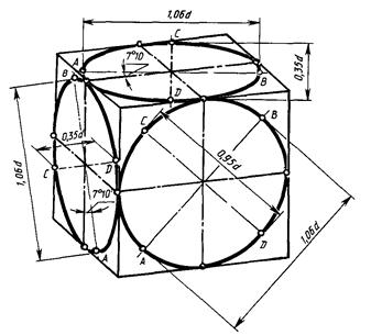 Окружности в диметрической проекции изображаются в виде эллипсов. Большая ось АВ эллипсов во всех случаях равна 1,06 d, где d - диаметр окружности. Малые оси CD эллипсов, расположенных на плоскостях, параллельных плоскости проекций П1 и П3, равны 0,35d, а на плоскости, параллельной плоскости П2 = 0,95 d.