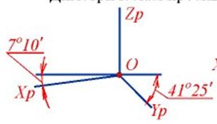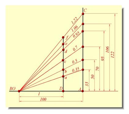 Рис. 13.9 Проведя две взаимно перпендикулярные прямые AB и AC, на одной из них, например на AB, от точки A откладывают 100 мм. Затем на AC от той же точки A откладывают 35, 50, 70, 95, 106, 122 мм. Полученные точки соединяют с точкой O. Если от точки O по горизонтали отложить размер l, то взятые по вертикали отрезки Da, Db,..., Df pавны соответственно 0,35 l; 0,5 l;...; 1,22 l. Hа наклонных линиях диаграммы наносят значения коэффициентов, которым эти линии соответствуют. Использование диаграммы значительно упрощается, если ее выполнить на миллиметровой бумаге. 13.3.2. Прямоугольная диметрическая проекция