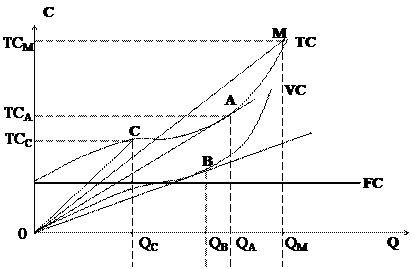 Издержки - это затраты ресурсов, принявшие на рынке стоимостную форму. Наибольшее практическое значение имеет деление издержек на постоянные и переменные. Графическим изображением постоянных издержек будет прямая TFC, параллельная оси абсцисс. К постоянным издержкам, как правило, относятся: оплата обязательств по облигационным займам, рентные платежи, часть отчислений на амортизацию зданий и оборудования, страховые взносы, жалование высшему управленческому персоналу и будущим специалистам фирмы. К переменным издержкам относят затраты на заработную плату, сырье, топливо, энергию, транспортные услуги. Различие между постоянными и переменными издержками имеет существенное значение. Постоянные издержки должны быть оплачены, даже если продукция не производится вообще. Переменными издержками предприниматель может управлять путем изменения объемов производства.